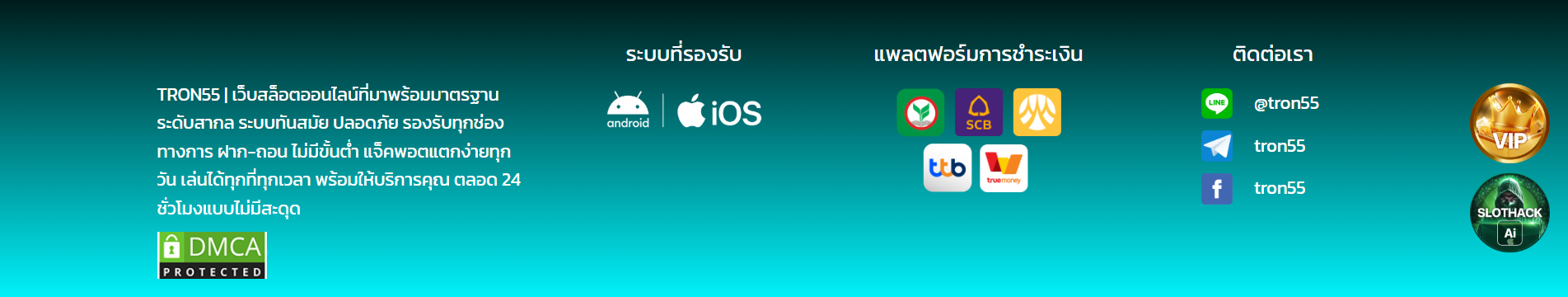 TRON55 ออกแบบแพลตฟอร์มให้ตอบทุกไลฟ์สไตล์ของผู้เล่น ตั้งแต่ระบบฝาก-ถอนอัตโนมัติที่ทางเว็บชูว่าเข้าถึงเงินภายใน 10 วินาที ไปจนถึงการรองรับการเล่นทุกแพลตฟอร์ม ไม่ว่าจะเป็นมือถือ แท็บเล็ต หรือคอมพิวเตอร์ ทำให้คุณสามารถปั่นสปินได้ทุกที่ทุกเวลาโดยไม่สะดุด